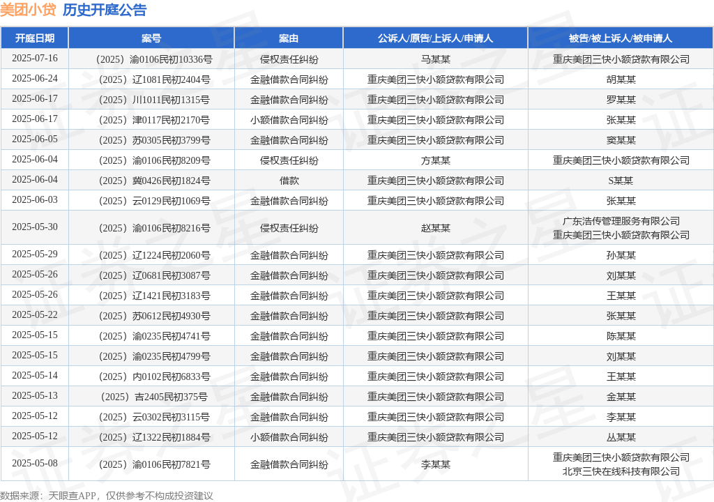 本站消息,根据天眼查APP显示,近日公布了一则重庆美团三快小额贷款有限公司作为原告/上诉人的开庭公告涨停吧,详细内容如下: